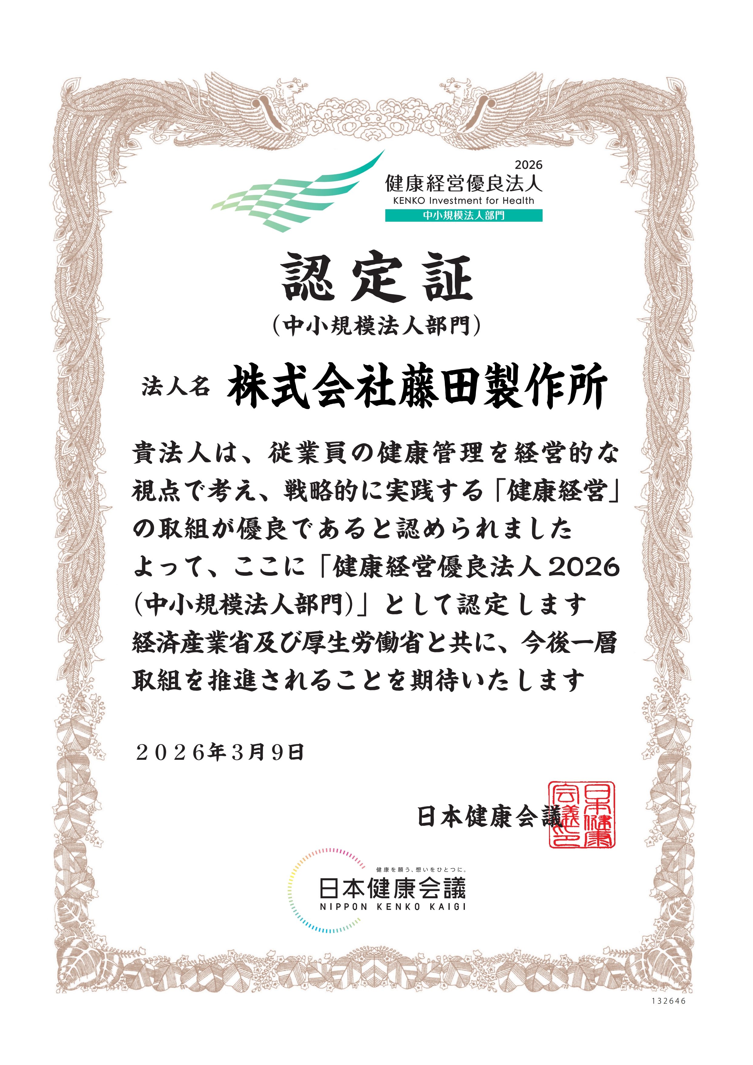 健康経営優良法人認定証 Certification of Health & Productivity Management Organization
